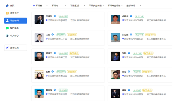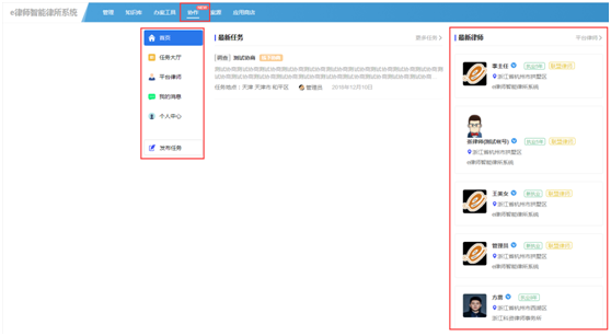 進(jìn)入“e律師”律所管理系統(tǒng)之后點(diǎn)擊上方菜單按鈕:「協(xié)作」進(jìn)入?yún)f(xié)作頁面,左側(cè)菜單分別包含了:首頁,任務(wù)大廳,平臺(tái)律師,我的消息,個(gè)人中心,發(fā)布任務(wù)。