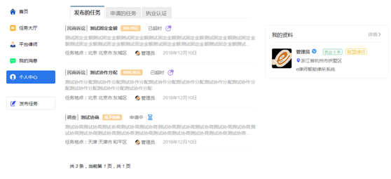 顯示當(dāng)前登陸用戶的個(gè)人信息,發(fā)布的任務(wù),申請(qǐng)的任務(wù),執(zhí)業(yè)認(rèn)證信息。